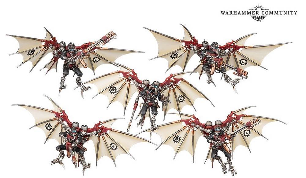 One of many specialised castes of cyborg warriors available to the Adeptus Mechanicus, the Pteraxii are optimised for instinctive reaction and agility. Pteraxiis reflexes are accentuated by paring back elements of cogitation that impede their prim