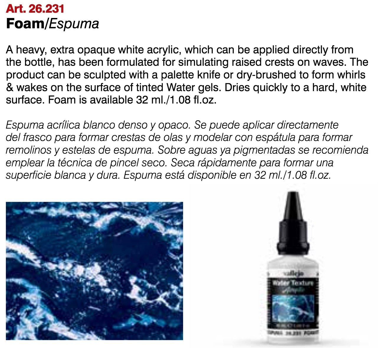 Foam & Snow, a heavy, extra opaque white acrylic, applied directly from the bottle fir raised crests on waves, sculpted with a palette knife fir snow & ice effects, or dry brushed to form whirls & wakes of foam