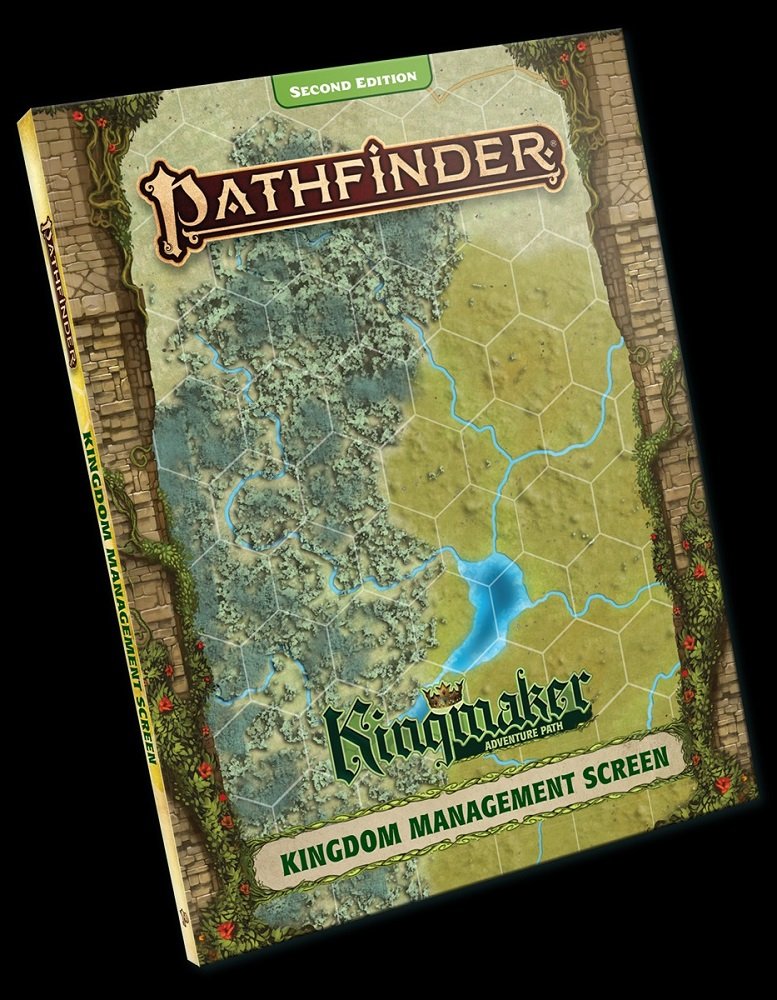 Keep the essential rules for kingdoms and armies on hand—and protect your notes and die rolls from players’ eyes—with the Pathfinder Kingmaker Kingdom Management Screen! This beautiful four-panel, portrait-style screen features a sprawling map