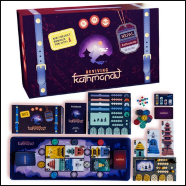 Reviving Kathmandu (the second game in the Globetrotter Series) is a bidding and set collection game for 1-6 players. In the game, players are builders who travel to Nepal. They’ll compete to earn the title of Most Respected Architect in Kathmandu.