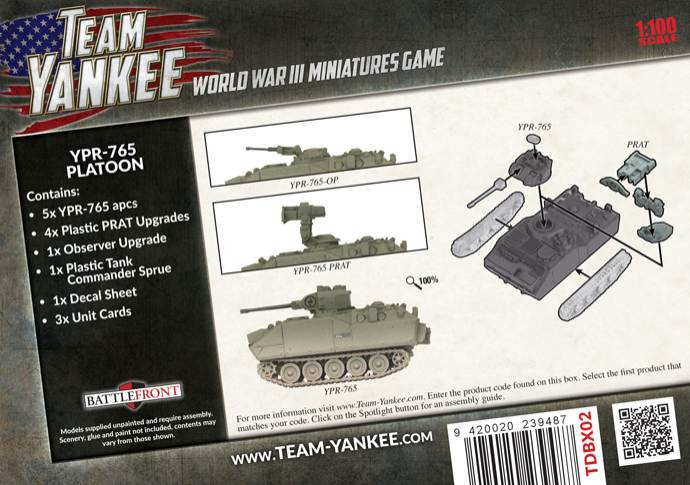 Includes five YPR-765 APCs, one observer upgrade, four plastic PRAT upgrades, one plastic Tank Commander sprue, one decal sheet and three Unit cards.x0Dx0Ax0Dx0AThe YPR-765 PRI (pantser-rups-infanterie, or armoured tracked infantry) is the basic armoured inf