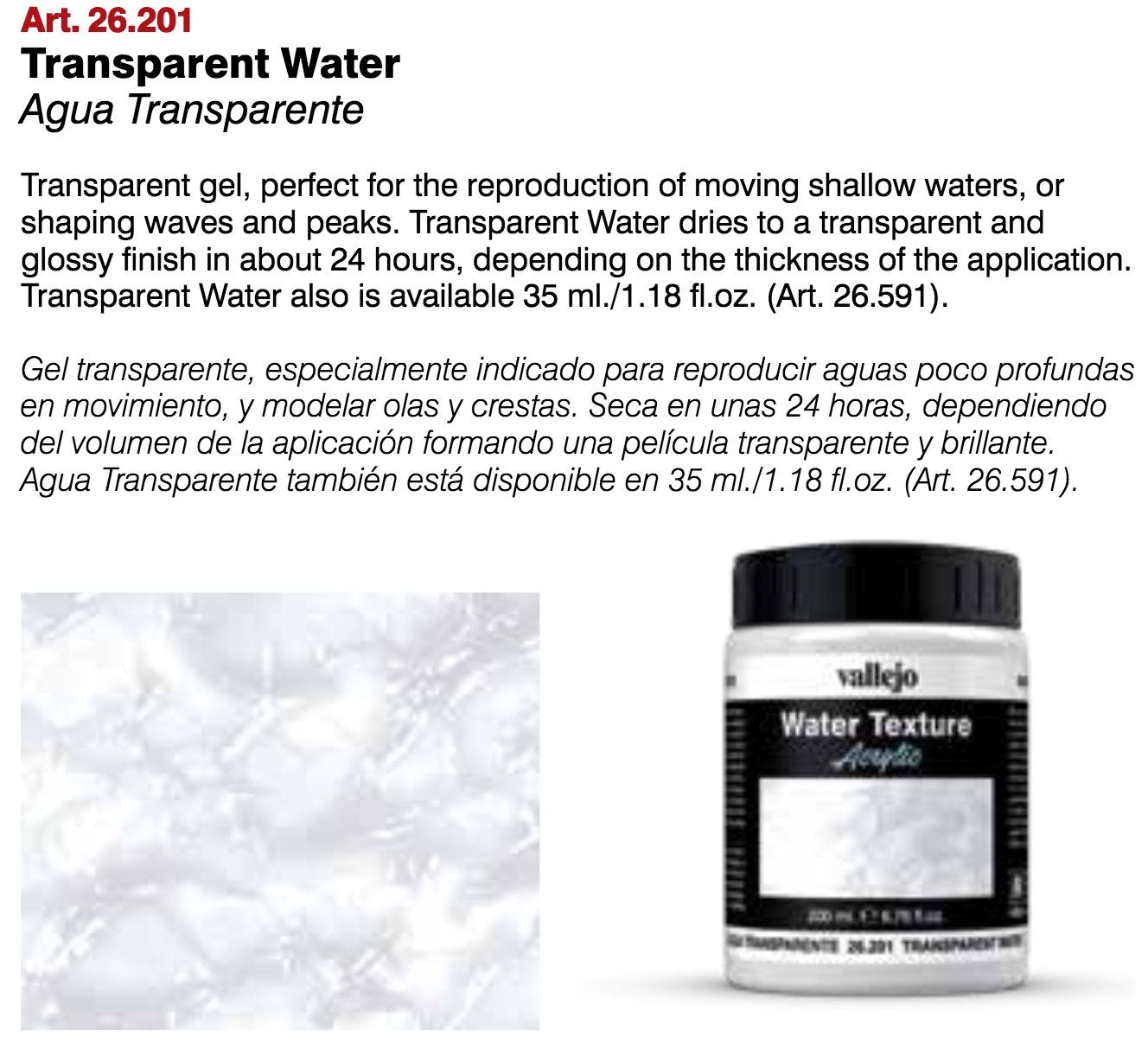 Vallejo Water Effects is a heavy bodied acrylic gel which can be shaped with a brush, palette knife, or any other tool to create waves, ripples, waterfalls and ice effects. The Water Effects products dry to a hard, clear finish in abou